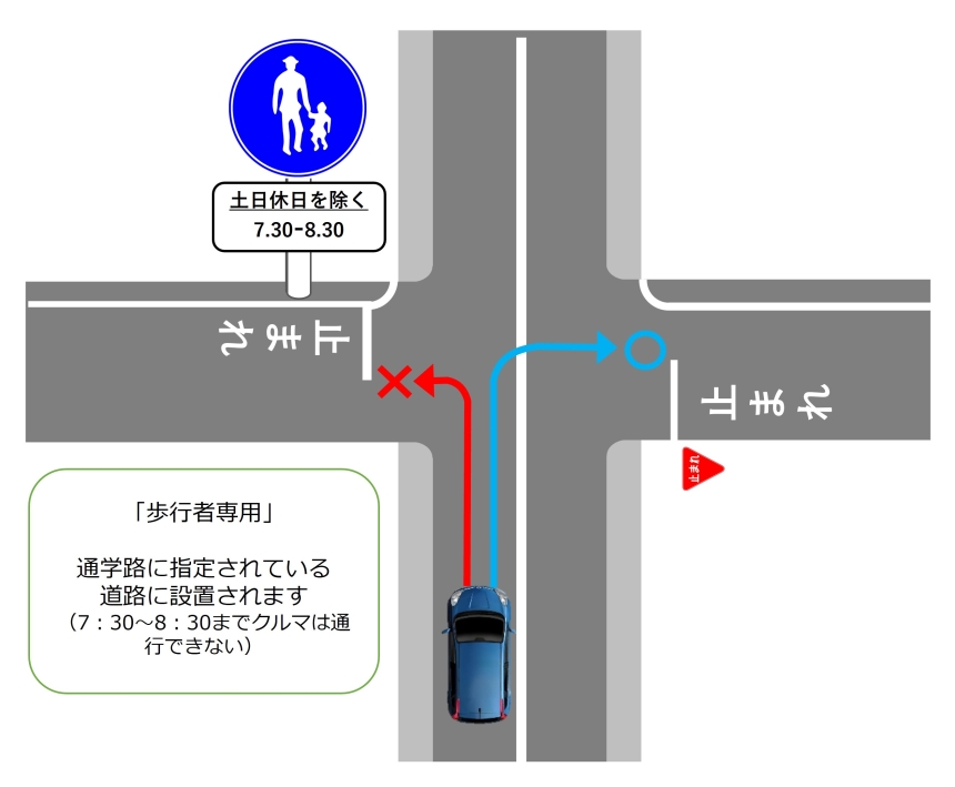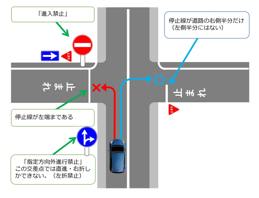交差点付近などでは、通行を禁止する標識がないかしっかり確認することが大切です。